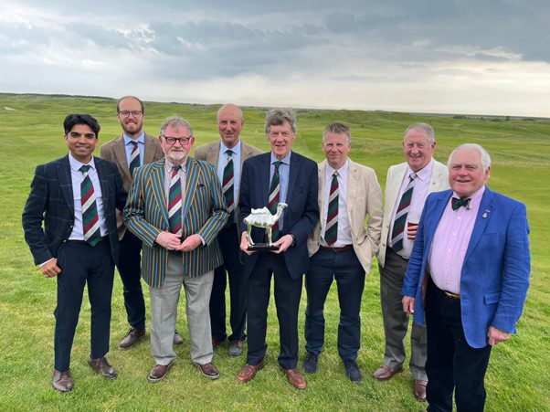 The distinctive camel trophy set off from the club with the EPICS for a golfing tour of Kent; it is pleasing to report that it has come home with them too, following another win against the Reform Club; golf captain Alan Botterill and the camel are flanked by (left to right) Sachin Gupta, Nik Haukohl, John Braithwaite, Ben Hurworth, James Bell, Graham Naisbitt and Ray McGhee
